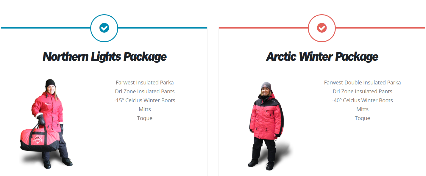 加購之禦寒衣物一般為左邊版本,白馬日常氣候已可充分保暖,惟若遇極端氣候(如:暴風雪)或氣溫低於零下40度時,導遊為維護旅客安全,可能會要求加價購買右邊之衣物。